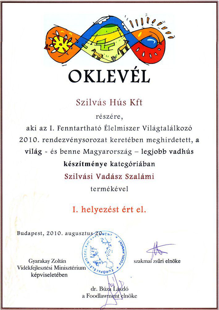 „Azt természetesnek tartottuk, hogy ott a helyünk a kiállításon, de nem állt szándékunkban indulni a versenyen. Ám a szervezők azt kérték, hogy vadhúskészítmény kategóriában nevezzünk. Ennek az invitálásnak nem tudtunk ellenállni, három szál Szilvási vadász szalámit az összes kötelező kísérő dokumentummal átadtunk a versenybizottságnak. Már szinte el is felejtettük ezt a kis epizódot, amikor kaptuk a telefont, hogy augusztus 23-án vegyünk részt a világtalálkozó záró gálaestjén, ahol kiosztják azokat a díjakat, amelyeket a Budai Várban, az öt vidéki helyszínen, valamint Sepsiszentgyörgyön megtartott hús-bajnokságok legjobbjai nyertek. Köztük mi a vadász szaláminkkal, ami kategóriagyőztes lett, vagyis világbajnok” – mesélte el a siker hátterét a Szilváshús Kft, egyik tulajdonosa, Cziczás-Tóth Marianna.